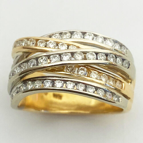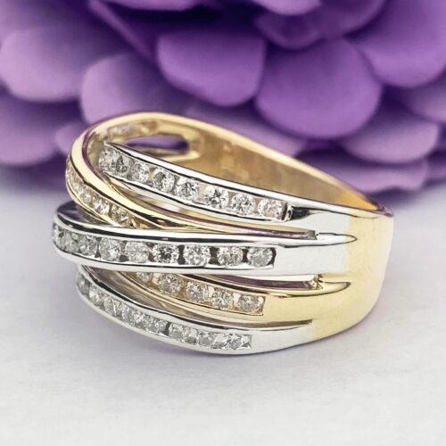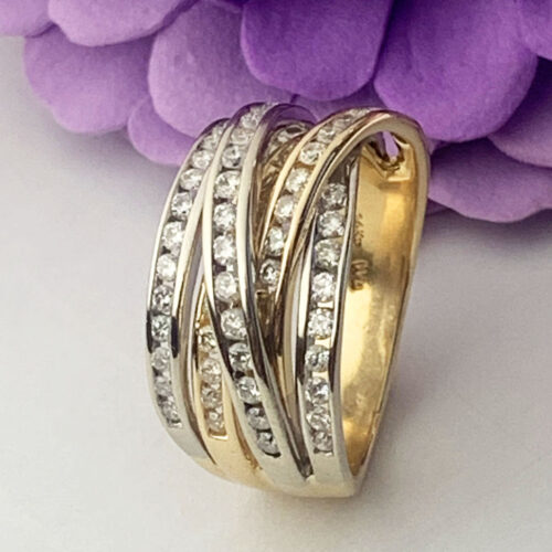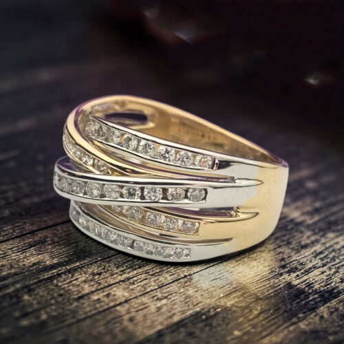 A distinctive 14K gold two-toned ring with 5 intermingled bands of diamonds from another time. The channel-set design reflects the confident style of the late 20th century. Approximately 25–30 years old, it is timeless and elegant.