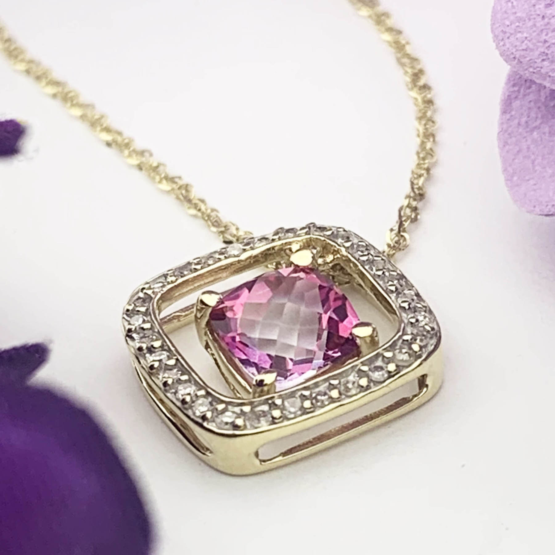 Unveil elegance with this vintage one-of-a-kind pink tourmaline pendant, where art and nature meet in harmony.  A checkerboard-cut pink tourmaline shimmers with light from every angle—its unique faceting ignites a vivid brilliance. Suspended in a delicate dance, the gem is embraced by an orbit of diamonds.